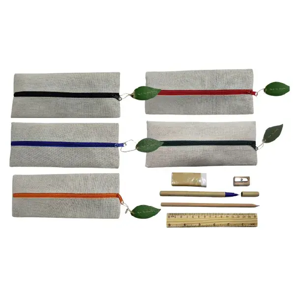 Cartuchera con Cierre. Descripcion: 2 lápices, 1 lapicero ecológico, una regla, un tajador, un borrador. Medidas: 22 cm x 12.5 cm.