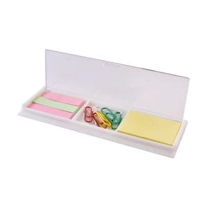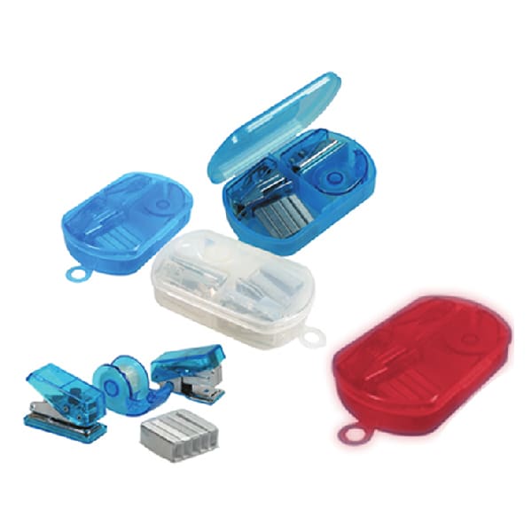 Medidas: 9 x 2 x 5.7 cm (Aprox.) / Descripción: Estuche de plástico transparente, incluye 1 engrapador, saca grapas y dispensador con cinta adhesiva.