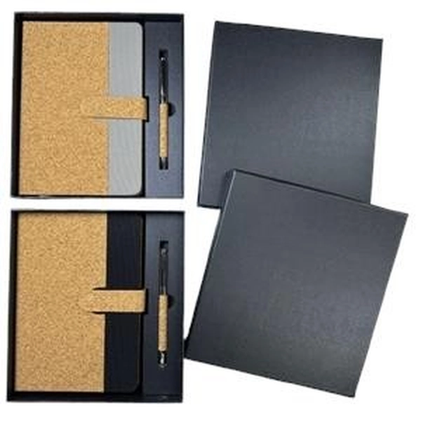 Set Libreta Lapicero. Libreta de corcho + Lapicero de corcho/metal. Contienen: caja negra + ambos productos contienen sus bolsas transparentes individuales. Tamaño de la caja: 20.8 cm x 22.6 cm (Aprox). Tinta del lapicero: negro