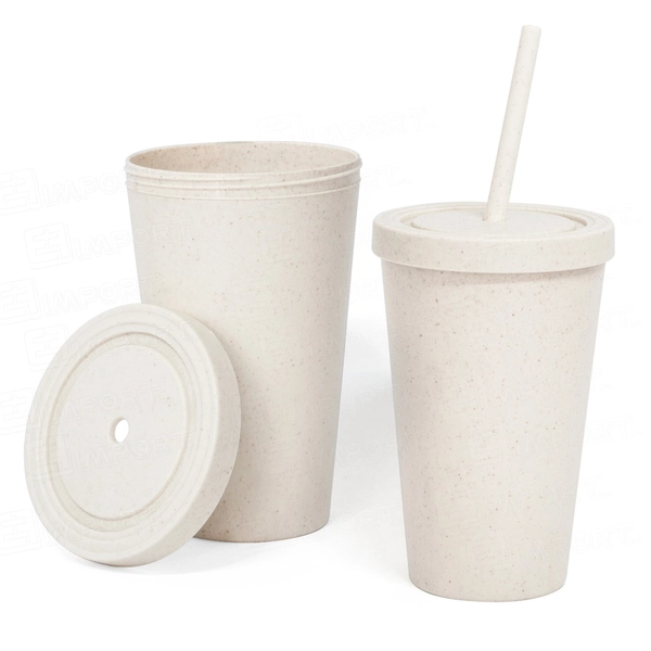 Vaso Fibra Trigo. Medidas: Altura: 14.9 cm, Ancho: 9.7 cm (tapa), Base 6.4 cm. Descripción: Material Fibra de Trigo con Caña. Capacidad 500 ml.